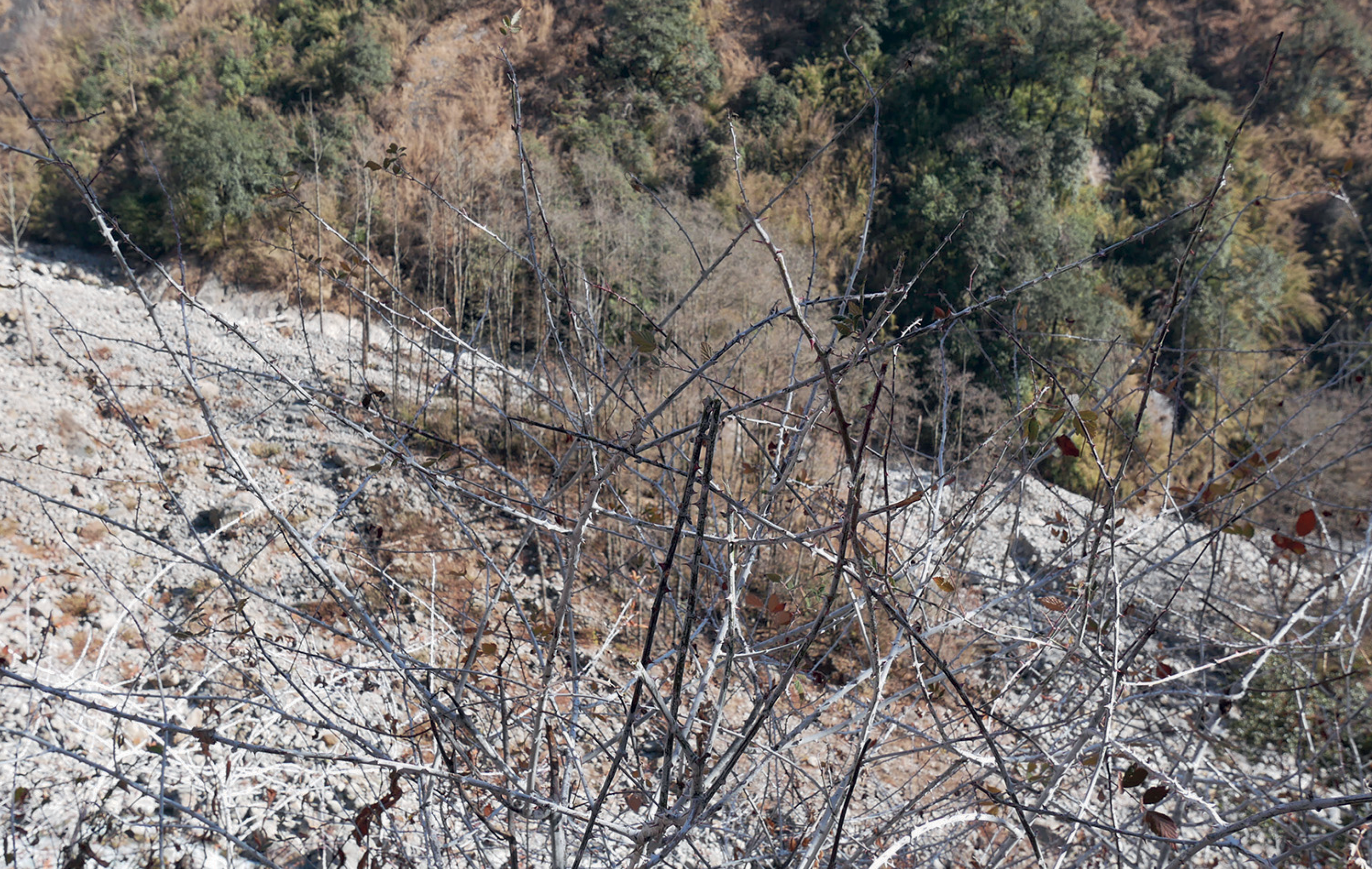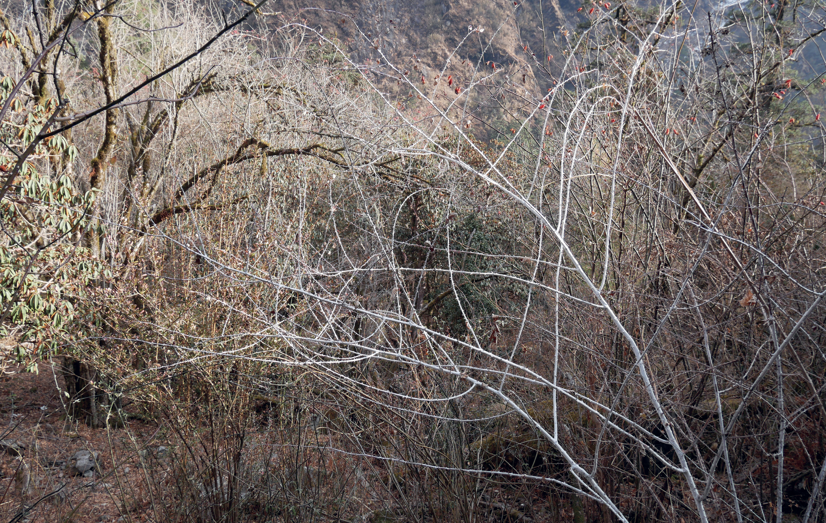 At roughly six hundred metres, the winter garden in Langtang with Rosa macroohylla (jangali gulab) in the foreground. Each plant was a pleasurable mystery to identify upon returning from Nepal, and I relied significantly on Manandhar's Plants and People of Nepal, with all Nepali names borrowed from his research.